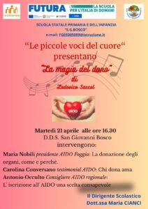 Martedì 21 aprile siete tutti invitati al convegno promosso da AIDO presso la nostra Direzione Didattica Statale “San Giovanni Bosco”, con l’obiettivo di sensibilizzare sul valore del dono e, in particolare, della donazione di organi, tessuti e cellule. L’incontro rappresenta un’importante occasione di approfondimento su un tema di grande rilevanza sociale e umana, grazie agli interventi di esperti del settore, volontari e testimonianze dirette. Al centro del dibattito ci sarà il concetto di “dono” come gesto di solidarietà e responsabilità civica, capace di salvare vite e offrire nuove speranze. A rendere ancora più piacevole il pomeriggio sarà l’esibizione del coro “Le Piccole Voci del Cuore”, che offrirà un momento musicale carico di emozione e coinvolgimento. Un appuntamento aperto a tutti, che unisce informazione, sensibilizzazione e cultura, invitando la comunità a riflettere sull’importanza di un gesto semplice ma fondamentale: dire sì al dono.